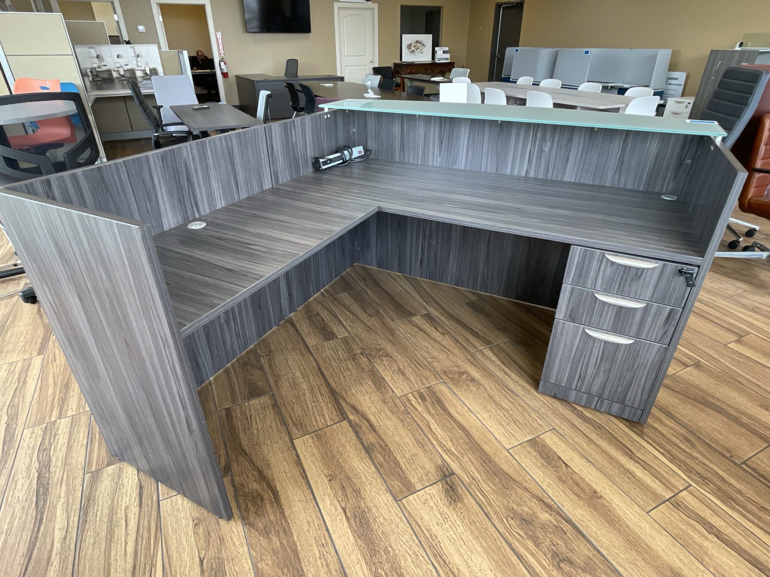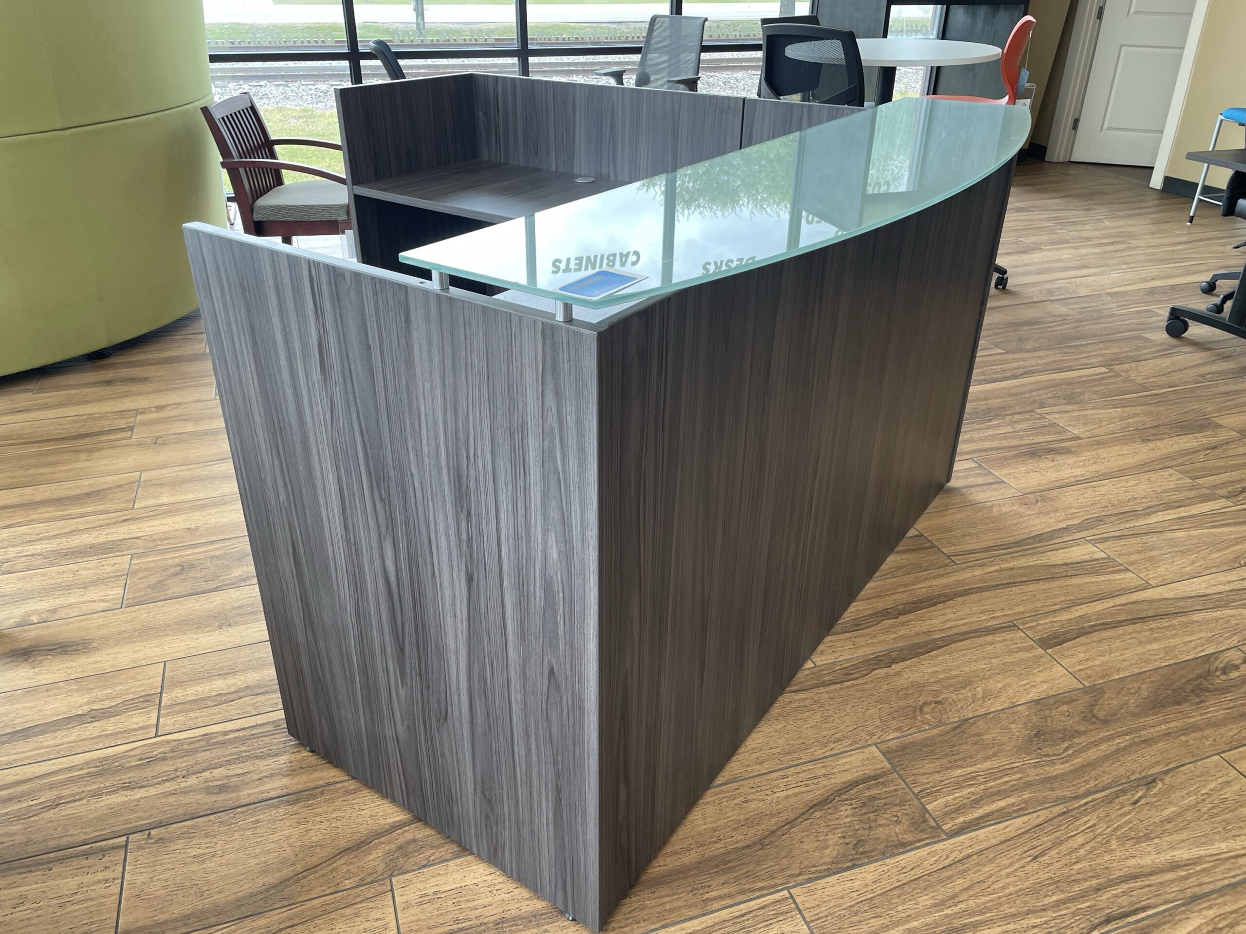Constructed using high-quality gray laminate, this reception station is not just visually appealing but built to last. The laminate finish is resistant to scratches and spills, ensuring it remains pristine even in high-traffic areas. The glass transaction top adds a sophisticated touch while providing a functional surface for client interactions. This durable piece of furniture is engineered to handle the everyday wear and tear of a professional setting while remaining stylish and functional for years to come.