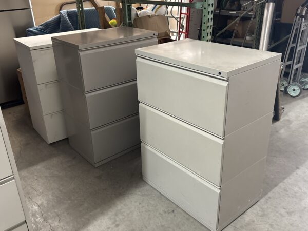 Constructed from high-quality materials, these used 3-drawer lateral file cabinets are built to last. They are equipped with smooth-gliding drawers that ensure effortless accessibility to your documents and a robust locking system to keep sensitive files secure. Whether you need to organize paperwork, folders, or other essentials, these cabinets offer ample storage space with an intelligent layout that accommodates oversized files and standard documents alike.